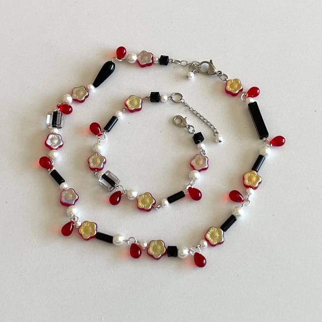 made with czech glass beads, glass pearls, and a stainless steel lobster clasp and extender